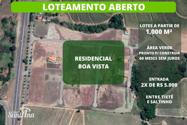 Localizado na Rodovia Cornélio Pires (SP-127), próximo a entrada do Bairro Arraial São Bento, entre Tietê e Saltinho/SP, o loteamento aberto está ao lado de uma área verde com mais de 23 mil m² e pronto para construir!!! Não é condomínio. Porém, é uma única entrada e os moradores fecham o portão eletrônico à noite!!!